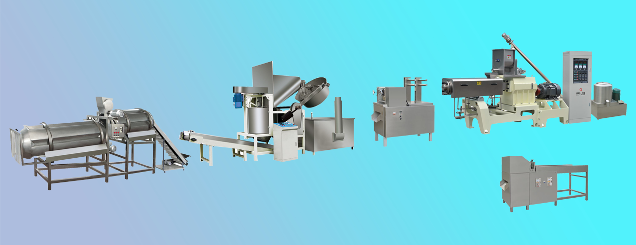 拌粉機→螺旋上料機→雙螺桿膨化機→整形切斷機→輸送機→提升機-稱斗-