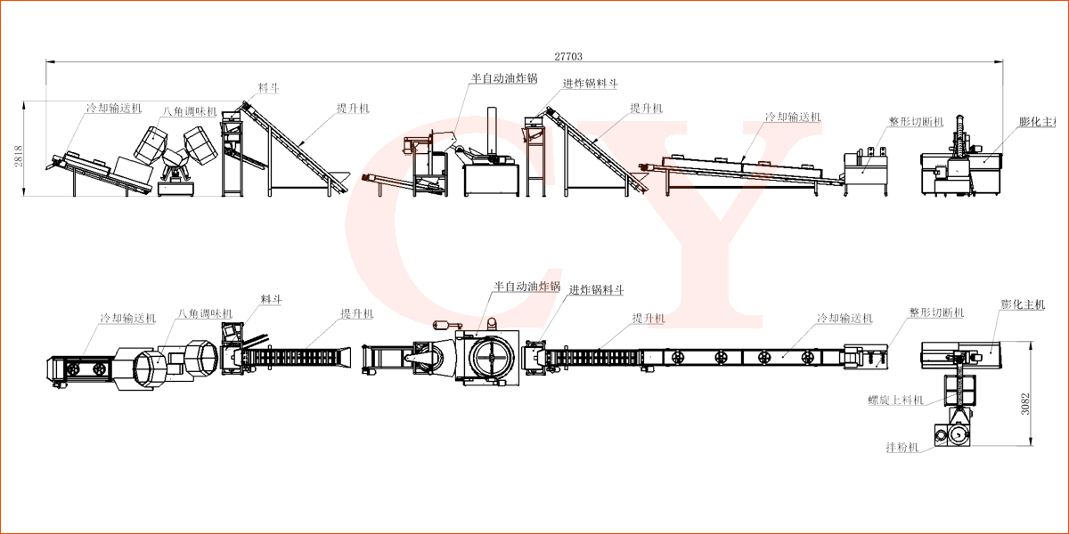 原料混合-膨化--整形切斷-油炸-噴油調味-冷卻-包裝
