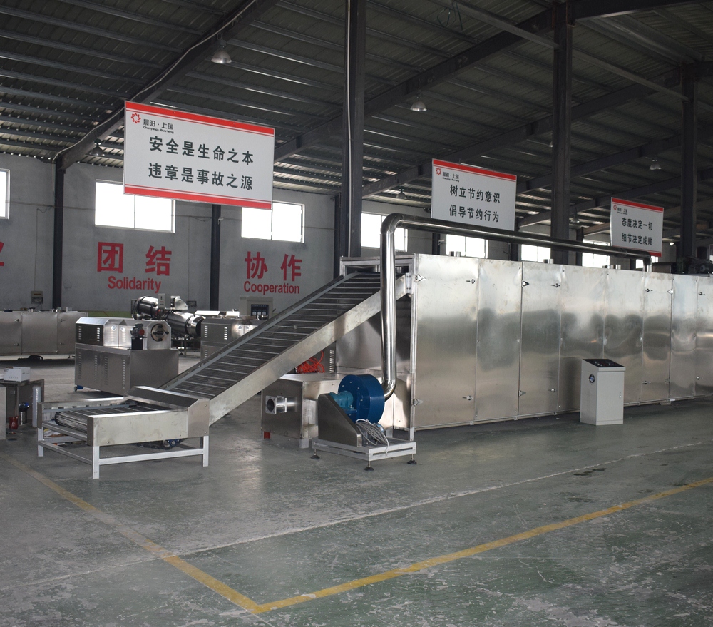 烤箱上料方式:可以直接選用帶爬坡結(jié)構(gòu)和外部借助輸送機(jī)送入烘干機(jī)料床,直接爬坡的烘干機(jī)結(jié)構(gòu)可以更直觀的觀測到物料布料狀況,多用于產(chǎn)量較大的生產(chǎn)線;借助外部上料的烤箱占地面積小,安裝方便,多用于單臺(tái)膨化主機(jī)的生產(chǎn)線配置