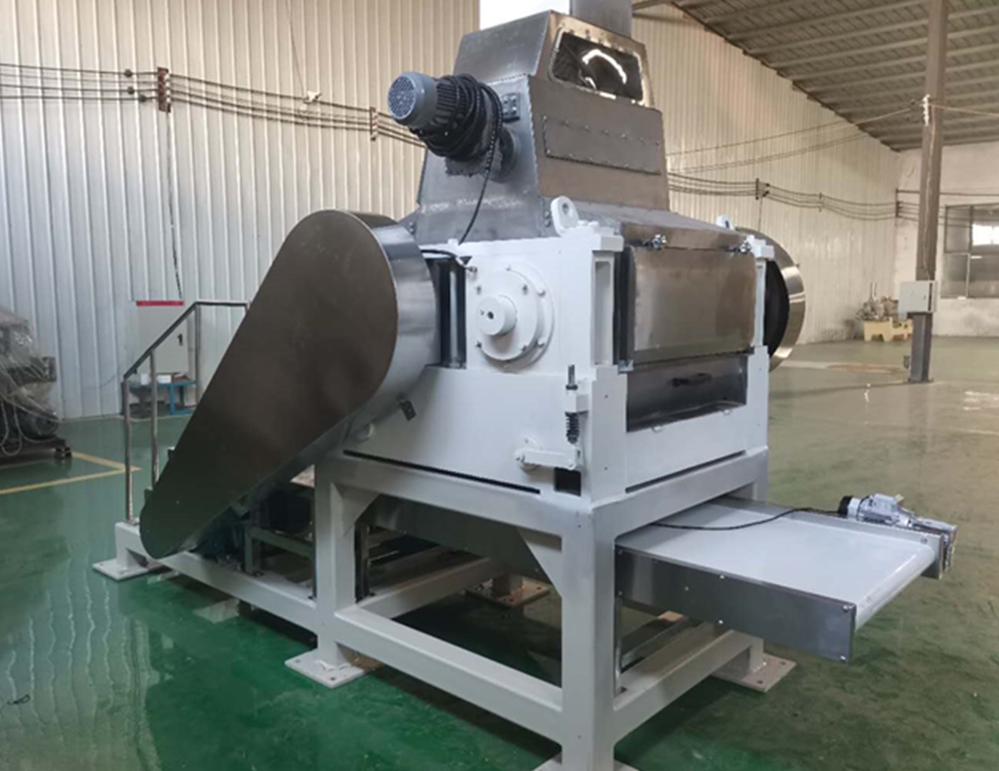 出料口:pvc輸送帶把壓好的片輸送到機器外側(cè),可有效避免風送機送料堵料的情況。