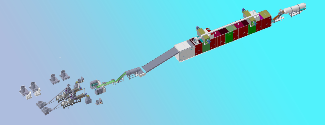 拌粉機→螺旋上料機→雙螺桿膨化機→夾心機-整形切斷機→提升機→六米五層烘干機-雙筒調(diào)味機